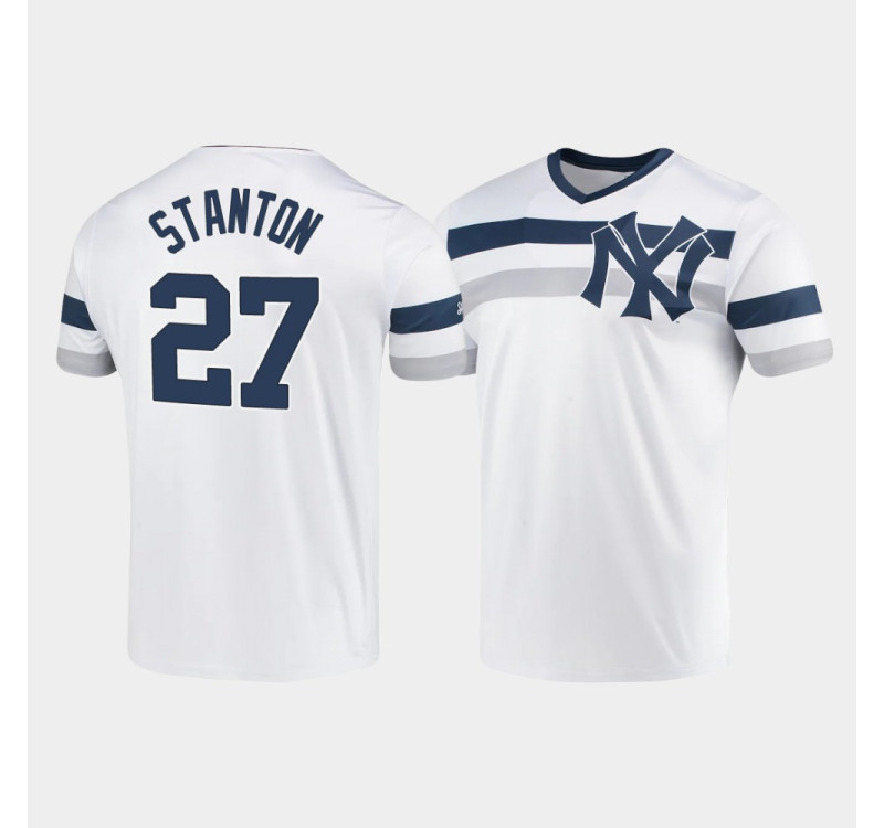 - Mens Yankees #27 Giancarlo Stanton White Cooperstown Collection V-Neck Jersey